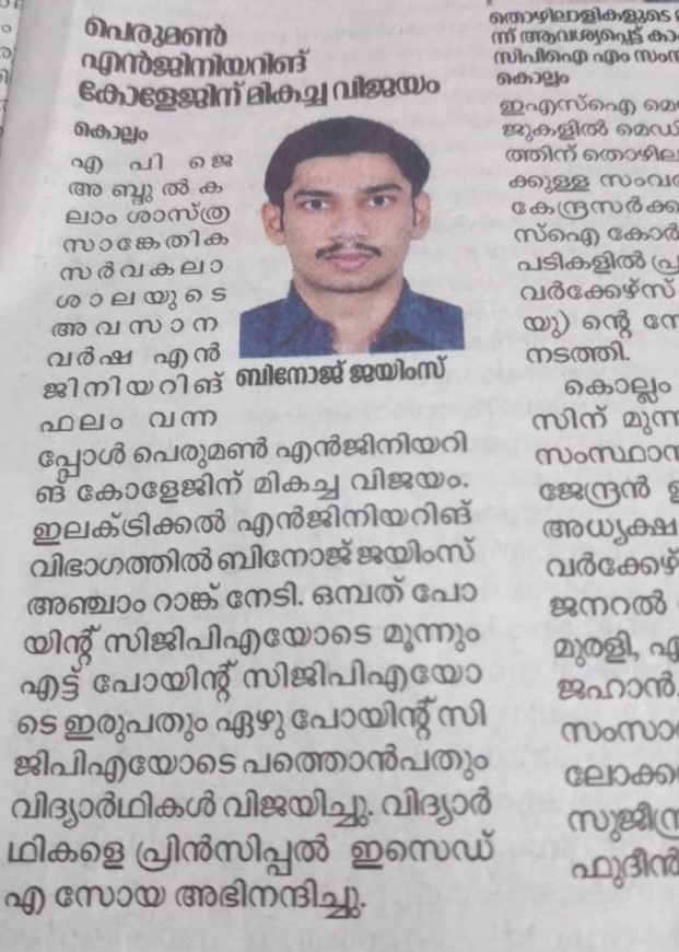 The Department of Electrical and Electronics Engineering in College of Engineering Perumon has been functioning from the year 2000, with an intake of 60. The department, with its well-qualified and experienced faculties and technical staffs, is committed to excel in Electrical Engineering through proper education and research.