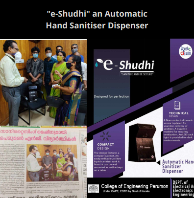 E-Shudhi - Automatic Sanitizer dispenser unit was developed during the initial period of pandemic. Initially 25 units were developed in the first phase and distributed to various government firms and hospitals. Later the model was redesigned and 30 units were developed in the second phase as per the requirements from public health centre, government offices, and educational institutions across Kerala, Tamil Nadu and Delhi.
